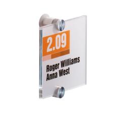 • eleganckie tabliczki, wykonane z wysokiej jakości szkła akrylowego • dwie stabilne płytki akrylowe wraz z folią znajdującą się pomiędzy nimi są przymocowane do ściany przy pomocy dwóch śrub • foliowe etykiety w formacie A4 dzięki perforacji łatwo dzielą się na mniejsze • nadruku na foliach można dokonać za pośrednictwem drukarki laserowej zarówno w czerni jak i w kolorze