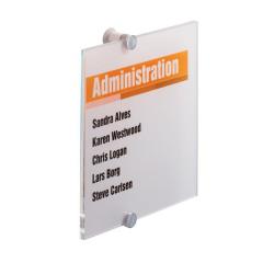 • eleganckie tabliczki, wykonane z wysokiej jakości szkła akrylowego • dwie stabilne płytki akrylowe wraz z folią znajdującą się pomiędzy nimi są przymocowane do ściany przy pomocy dwóch śrub • foliowe etykiety w formacie A4 dzięki perforacji łatwo dzielą się na mniejsze • nadruku na foliach można dokonać za pośrednictwem drukarki laserowej zarówno w czerni jak i w kolorze