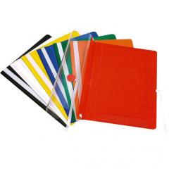 • z folii PVC • przód twardy przezroczysty, tył twardy kolorowy • wewnątrz trzy plastikowe zakładki zabezpieczające dokumenty przed wypadaniem • tasiemki do wiązania przymocowane do okładki