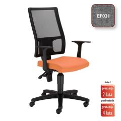 • miękkie siedzisko tapicerowane tkaniną Oban z atestem trudnopalności • oparcie z siatki w kolorze czarnym posiada podparcie pod lędźwie • mechanizm umożliwiający blokadę kąta odchylenia oparcia w wybranej pozycji • regulowana wysokość krzesła • regulowana wysokość oparcia za pomocą śruby • stałe podłokietniki • nylonowa podstawa krzesła • kółka do powierzchni dywanowych w standardzie