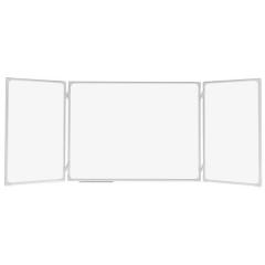 Wysokiej jakości tablica rozkładana suchościeralna biała z powierzchnią lakierowaną o właściwościach magnetycznych. Rama wykonana z profilu aluminiowego w kolorze srebrnym, wykończona eleganckimi, popielatymi narożnikami. Tył tablicy wzmocniono blachą ocynkowaną, która zapewnia jej stabilność i chroni przed wilgocią oraz wyginaniem. Dodatkowo produkt posiada 2 uniwersalne uchwyty do zawieszenia bloku oraz wygodną półkę o długości 30 cm, która zmieści wszelkiego rodzaju przybory niezbędne podczas prezentacji. Uwaga! Uchwyty do bloku można mocować tylko na skrzydłach tablicy. W zestawie: 2 uniwersalne uchwyty AS139, półka na markery, elementy mocujące. Tryptyki polecane są wszędzie tam, gdzie potrzebna jest duża powierzchnia do pisania, ale zachodzi potrzeba by ściana frontowa sali czasowo spełniała też inną funkcję niż tylko tablicy do pisania.