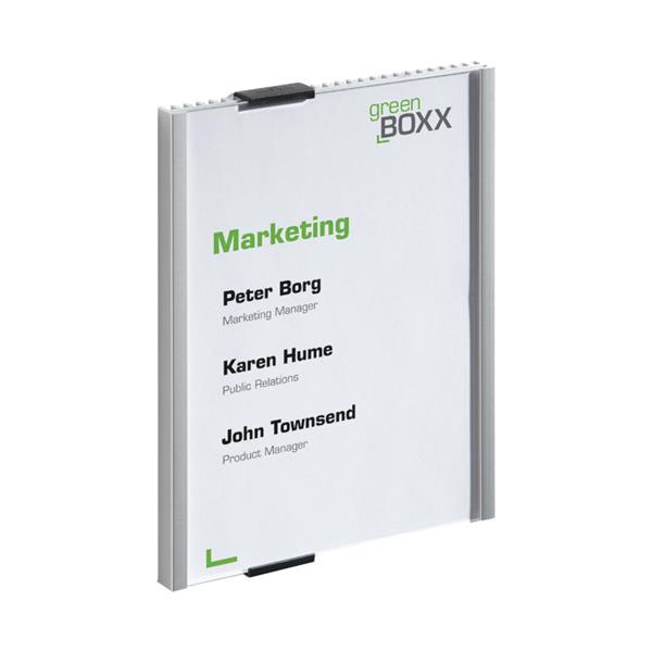 • eleganckie tabliczki, wykonane z wysokiej jakości szkła akrylowego • dwie stabilne płytki akrylowe wraz z folią znajdującą się pomiędzy nimi są przymocowane do ściany przy pomocy dwóch śrub • foliowe etykiety w formacie A4 dzięki perforacji łatwo dzielą się na mniejsze • nadruku na foliach można dokonać za pośrednictwem drukarki laserowej zarówno w czerni jak i w kolorze