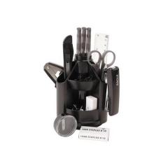 • obrotowy • w zestawie: zszywacz, rozszywacz, nożyczki, nóż do papieru, temperówka, gumka do ścierania, linijka 15 cm, długopisy (3 szt.), pinezki tablicowe (15 szt.), spinacze (20 szt.), zszywki nr10 (1 opak.) • wymiary: średnica 100 mm, wysokość 130 mm